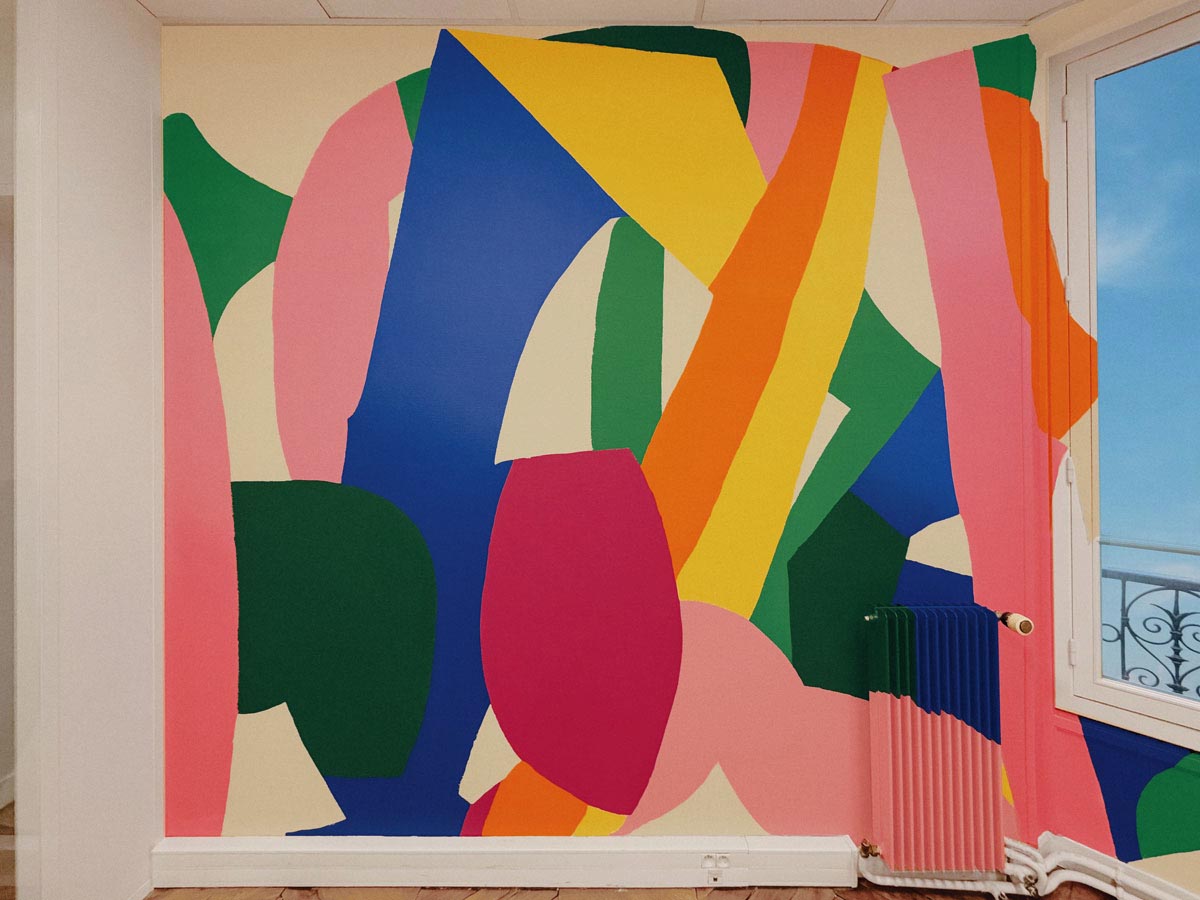 Within the Parisian offices of Dfns on Rue du Louvre, the workspace transcends its purely utilitarian function to become the receptacle of a chromatic exploration by Ludovilk Myers. This mural does not merely dress the walls; it dialogues with the very essence of the platform: the security and fluidity of digital assets. Where Dfns deploys its Wallets-as-a-Service infrastructure to redefine the finance of tomorrow, Myers responds with a visual grammar where the pictorial gesture seems to mimic the velocity of data flows. Curated by Robin Defilhes, the work is articulated as a topography of abstract forms—a sort of sensitive mapping of the invisible within the crypto ecosystem.