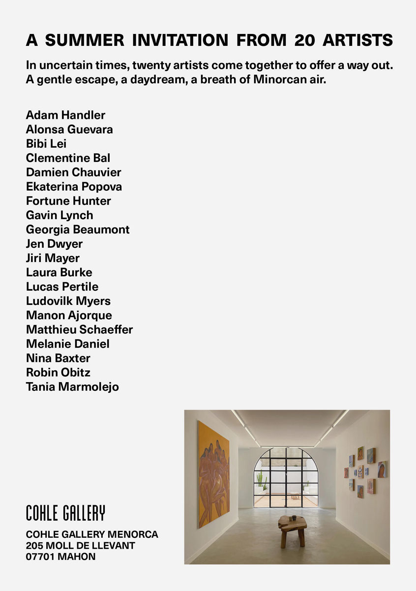 Tags: Abstract, Acrylic, Adam Handler, Alonsa Guevara, Art, Bibi Lei, Boat, Cactus, Clementine Bal, Cohle Gallery, Contemporary art, Damien Chauvier, Ekaterina Popova, Emergency Exit, Figurative, Fortune Hunter, Gavin Lynch, Georgia Beaumont, Group show, Ilk, Jen Dwyer, Jiri Mayer, Laura Burke, Lucas Pertile, Ludovilk Myers, Manon Ajorque, Matthieu Schaeffer, Melanie Daniel, Menorca, Nina Baxter, Painting, Robin Obitz, Tania Marmolejo, Yellow